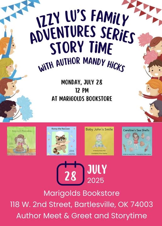 Monday July 28th 12:00 P.M. We are having a children's reading with local author Mandy Hicks!