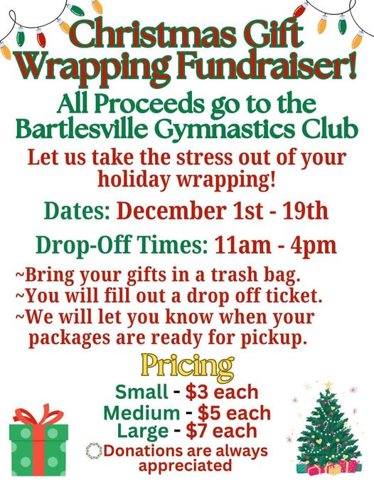 This Christmas season, let us take the stress out of your holiday preperation. The Gymnastics Club is offering a Gift Wrapping Service, All proceeds directly benefit our gym, helping us continue to provide opportunities for growth, training, and community involvement. Save time, enjoy the season, and support a great cause!