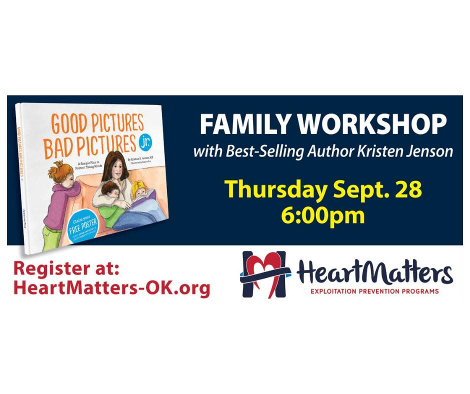 Come join author Kristen Jenson, with Defend Young Minds, as she highlights easy tips and advice from her best-selling book, Good Pictures, Bad Pictures. Her interactive presentation will make it easy for parents to learn how to protect their young kids (and kids to protect themselves) from exposure to innapropriate content. She will focus on pornography prevention for children between the ages of 3 and 13 as well as teens and social media. Dinner is provided and will begin at 6:00pm. The presentation will begin at 6:30pm. Be sure to register on our website at www.heartmatters-ok.org. Parents, Grandparents, and Caring Adults... You will not want to miss this!