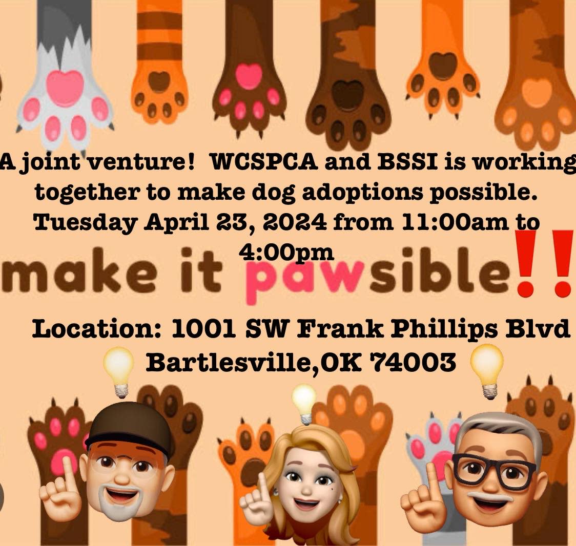 The Bartlesville Shooting Supply, Inc. is colaberating with the WCSPCA for a one day event at 1001 SE Frank Phillips Blvd., Bartlesville- a great opportunity for people in the community to see some awesome dogs up for adoption. Remember that you can always stop by on business days at the WCSPCA to see more.