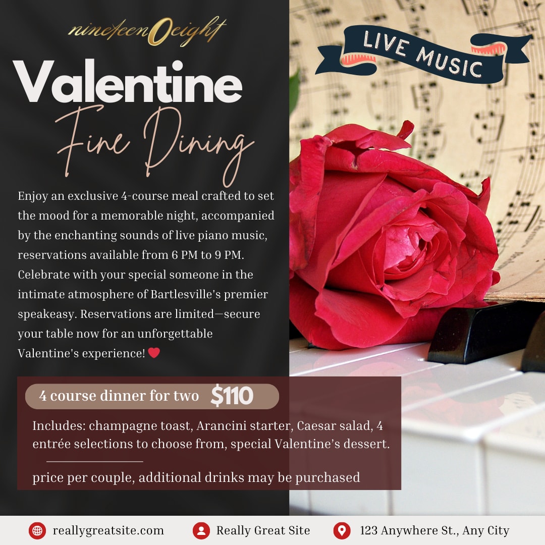 Looking for the perfect Valentine’s Day date? 💕 Join us at Nineteen0Eight for a romantic evening featuring a 4-course meal for two and live piano music from 6 PM to 9 PM. Your evening includes: 🍾 Champagne toast 🍴 Arancini starter 🥗 Caesar salad 🥩 4 entrée selections to choose from 🍰 A special Valentine’s dessert All this for just $110 per couple! ✨ Space is limited, so don’t wait—reserve your spot now and make this Valentine’s one to remember. ❤️ #ValentinesDay #Nineteen0Eight #RomanticDinner