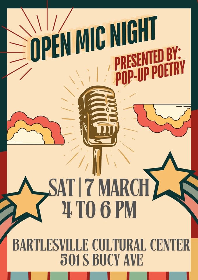 Join us for a fun and inspiring 𝐎𝐩𝐞𝐧 𝐌𝐢𝐜 𝐍𝐢𝐠𝐡𝐭 presented by Pop-Up Poetry this 𝐒𝐚𝐭𝐮𝐫𝐝𝐚𝐲, 𝐌𝐚𝐫𝐜𝐡 𝟕, 𝐟𝐫𝐨𝐦 𝟒–𝟔 𝐏𝐌 at the Bartlesville Cultural Center (Formerly Westside Community Center)!