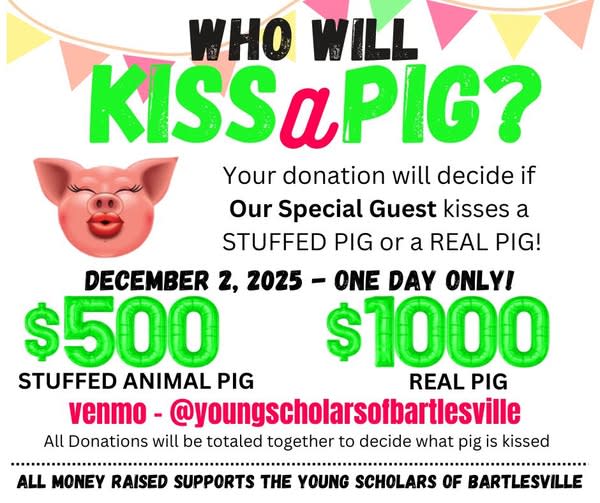 On December 2nd one special guest will kiss a pig, but which kind of pig? Stay tuned for updates. A fun and easy way to donate to Young Scholars of Bartlesville