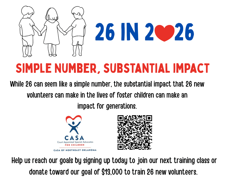 26 in 2026 Back to Member News 26 in 2026 By CASA of Northeast Oklahoma 2/17/2026 Images × Share × Email Facebook LinkedIn X Pinterest Powered By GrowthZone